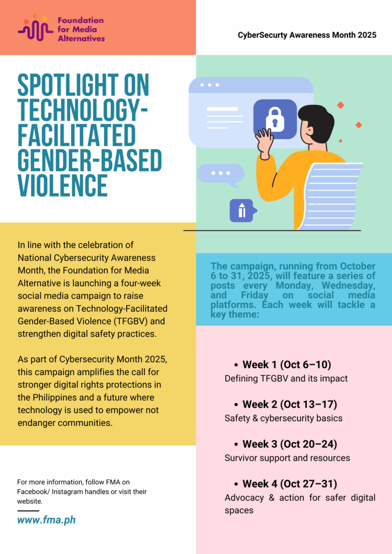 In line with the celebration of National Cybersecurity Awareness Month, the Foundation for Media Alternative is launching a four-week social media campaign to raise awareness on Technology-Facilitated Gender-Based Violence (TFGBV) and strengthen digital safety practices.