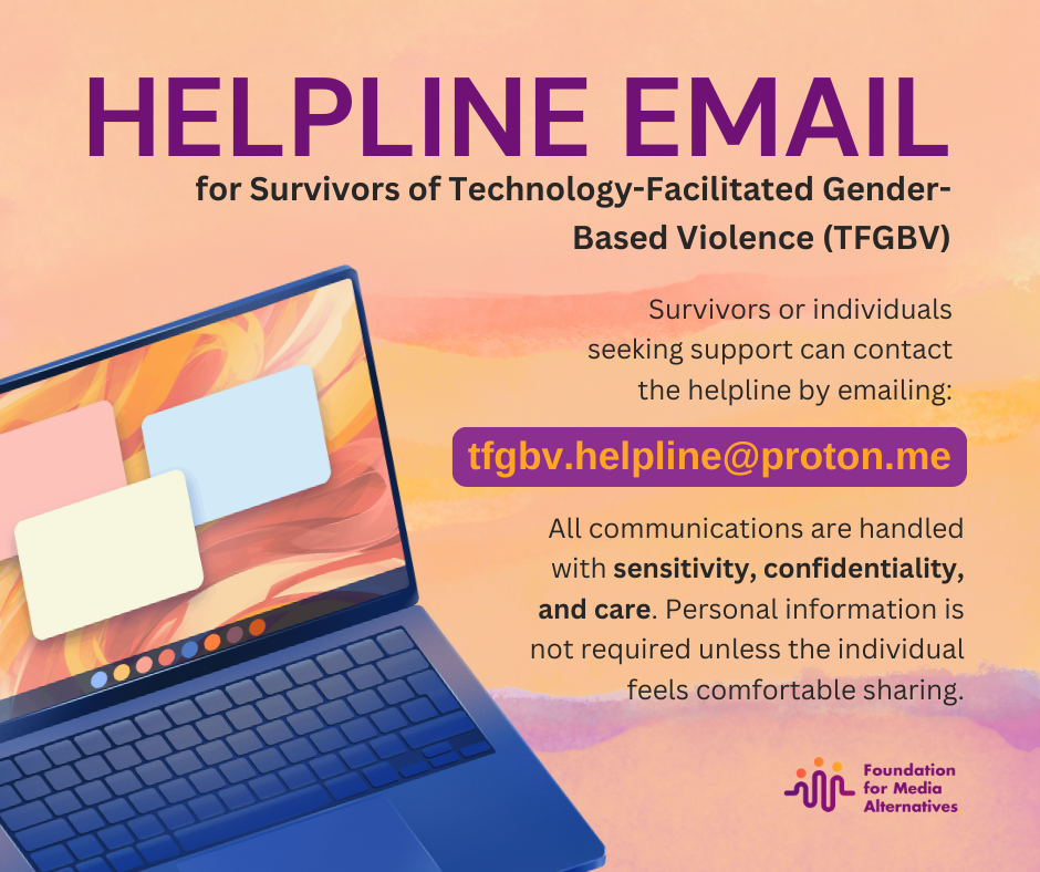 In observance of World Mental Health Day, the Foundation for Media Alternatives (FMA) proudly launches a new, dedicated helpline email tfgbv.helpline@proton.me offering a safe, confidential, and survivor-centered space for those affected by Technology-Facilitated Gender-Based Violence (TFGBV).