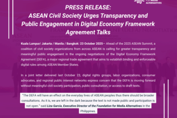 The Foundation for Media Alternatives (FMA) denounces the arrest of Rappler CEO Maria Ressa. As advocates of human rights and communication rights, FMA stands by press freedom and free speech as fundamental to civil liberty, especially at a time when the very foundations of democracy are under threat.